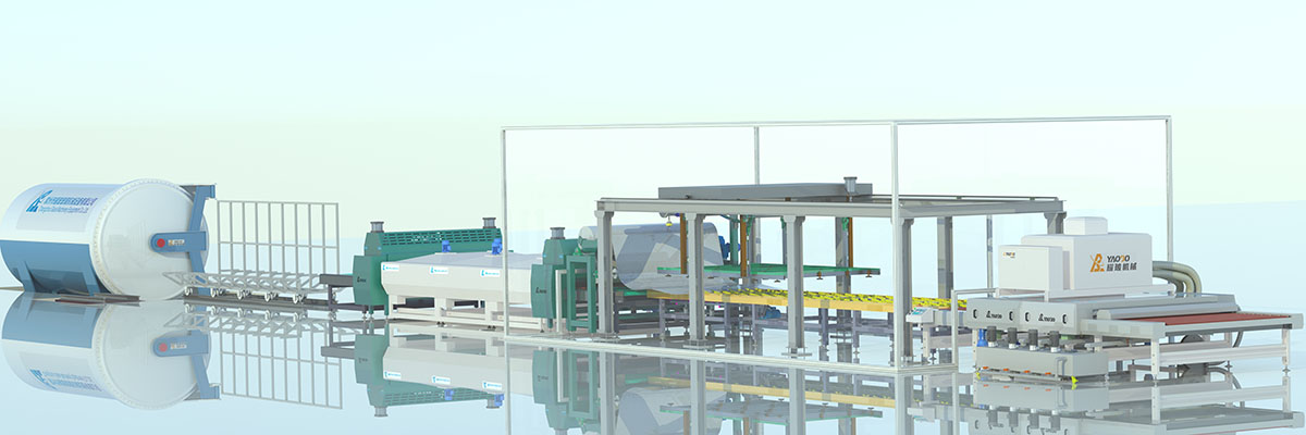 The fully automatic laminated glass production line is mainly composed of automatic loading table, glass cleaning and drying machine, transition conveying table (three sections), automatic pre-positioning machine, automatic suction cup hanger, laminating table, electric PVB film spreading machine, pre-pressing machine , automatic unloading table, autoclave and other equipment, this line has the following characteristics: